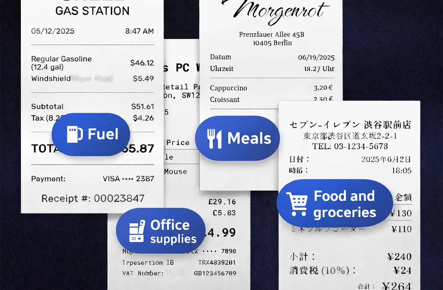 Our advanced AI, powered by large language models, can read receipts in nearly any language – including all Latin-variant languages (those using a–z with characters like ä, ö, å, ü, and ß), Japanese, and both simplified and traditional Chinese.
