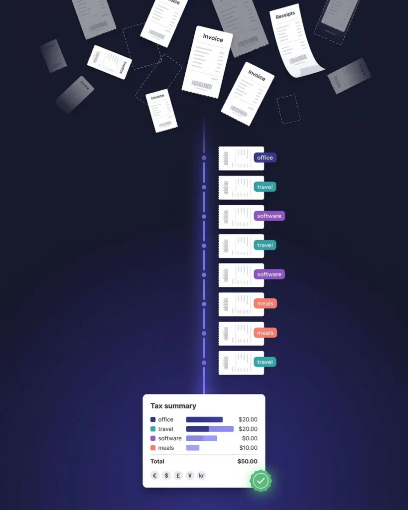 - AI automatically matches each transaction to the right receipt or invoice